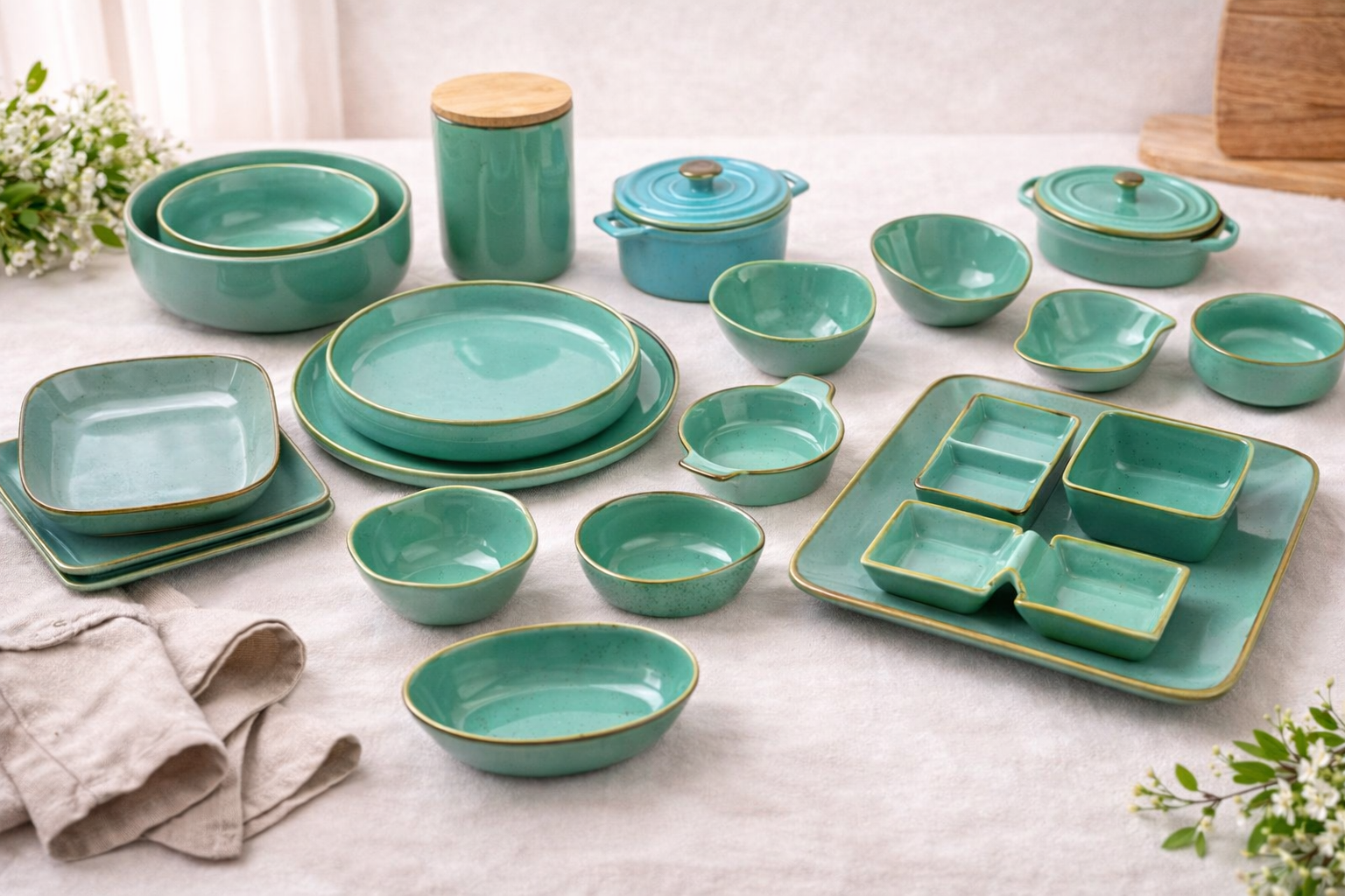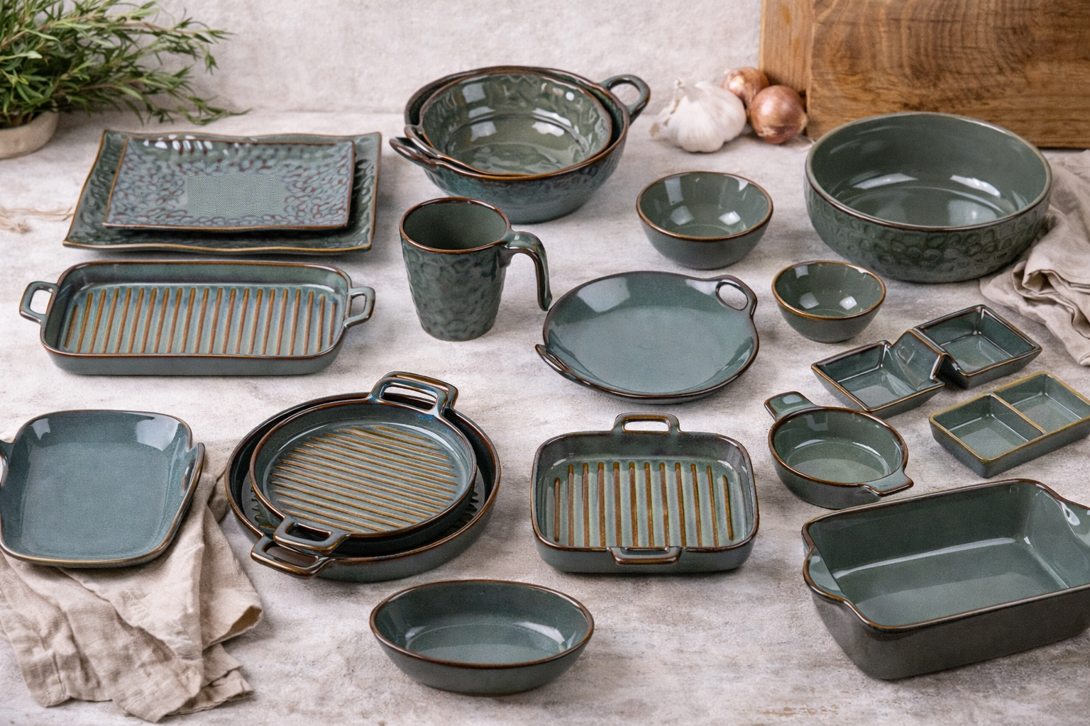 Everyday ceramic pieces designed for cooking, serving, and sharing meals.